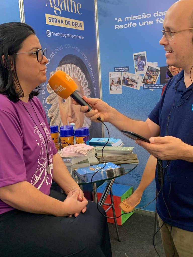 Durante os três dias de programação, o estande recebeu inúmeros visitantes, interessados em conhecer mais de perto a história, o carisma e o legado dessas mulheres que continuam inspirando gerações. Entre os momentos especiais vivenciados no espaço, destacou-se a visita de Ione Paiva, escritora da biografia de Irmã Adélia, além da presença do missionário da Obra de Maria, Ivanildo Silva, e da Rádio Olinda, que prestigiaram a participação das irmãs e contribuíram para a divulgação da missão do Instituto.
